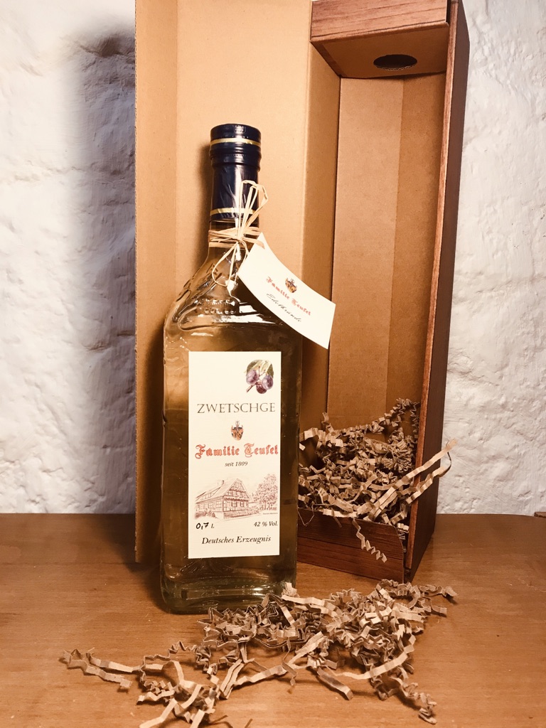 ,,Unser Zwetschgenwasser wird ausschließlich aus heimischen Früchten unserer Streuobstwiesen gewonnen. Die verwendeten heimischen Zwetschgensorten wachsen an traditionnellen Hochstammbäumen. Dadurch wird ein fruchtiges und geschmacksintensiveres Aroma garantiert.“